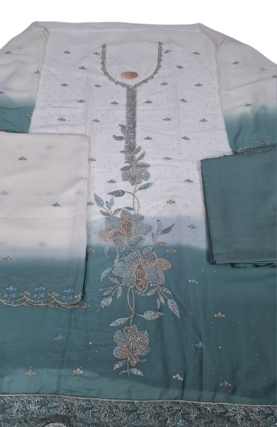 Make a graceful statement with this stunning unstitched double-shaded georgette suit, designed for elegant occasions. The shirt features full front embroidery with beautifully detailed sleeve work, creating a rich and refined look. Paired with a fully embroidered georgette dupatta and a plain dull shendun bottom, this ensemble blends luxury with softness—perfect for festive wear, parties, and evening celebrations.
