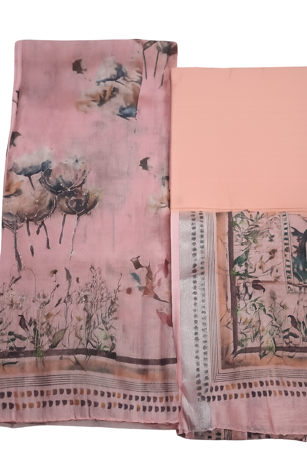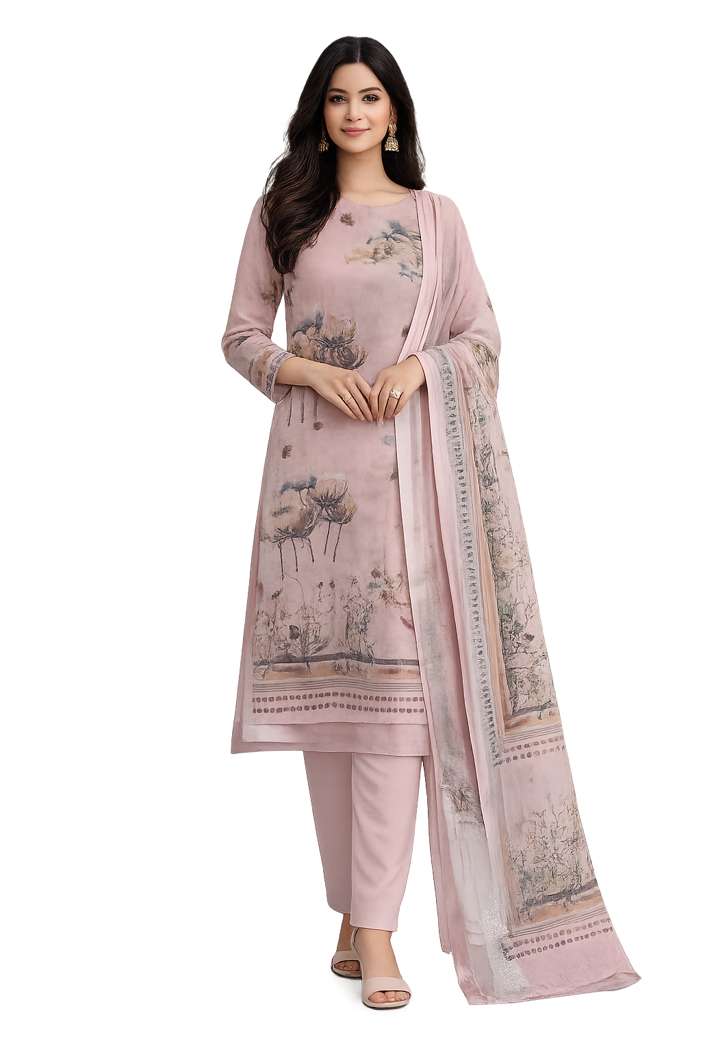 Soft, graceful, and effortlessly elegant, this unstitched suit set features a 2.5 meter linen cotton shirt adorned with delicate ari work, paired with a 3 meter heavy rayon plain bottom for a refined finish. The 2.5 meter digitally printed linen cotton dupatta adds a dreamy artistic charm, making it perfect for classy everyday wear and special moments alike.