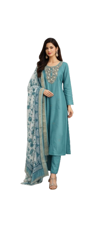 Step into elegance with this beautiful rayon three-piece Kurti Pant & Dupatta set in XXL size. The 45-inch kurti features stunning moti and cardana work on the neckline with a perfectly tailored lining for a premium finish. Designed with classy three-fourths sleeves, it comes with a plain matching bottom and a graceful cotton dupatta highlighted with a rich Banarasi border. Perfect for festive and party wear.