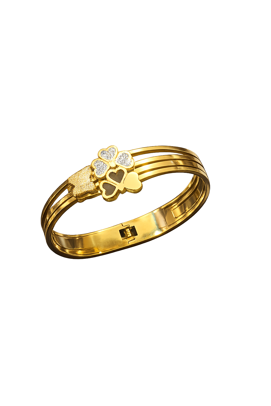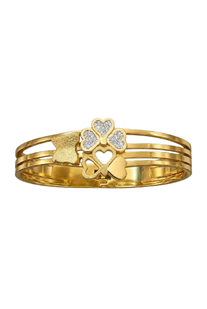 A charming gold bracelet featuring a sparkling clover centerpiece and sleek layered bands, blending elegance with a touch of luck-inspired beauty. Perfect for graceful everyday and festive wear.