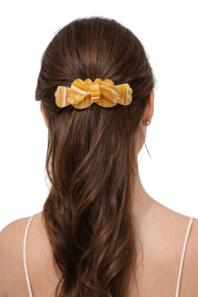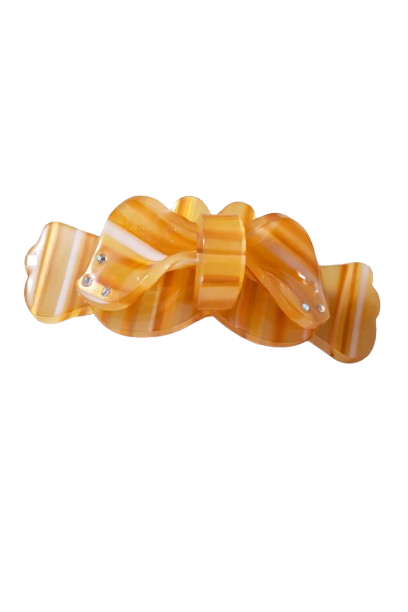 Chic bow-style hair clip with glossy striped finish and subtle sparkle accents, perfect for adding a stylish, polished touch to everyday hairstyles or elegant half-up looks.