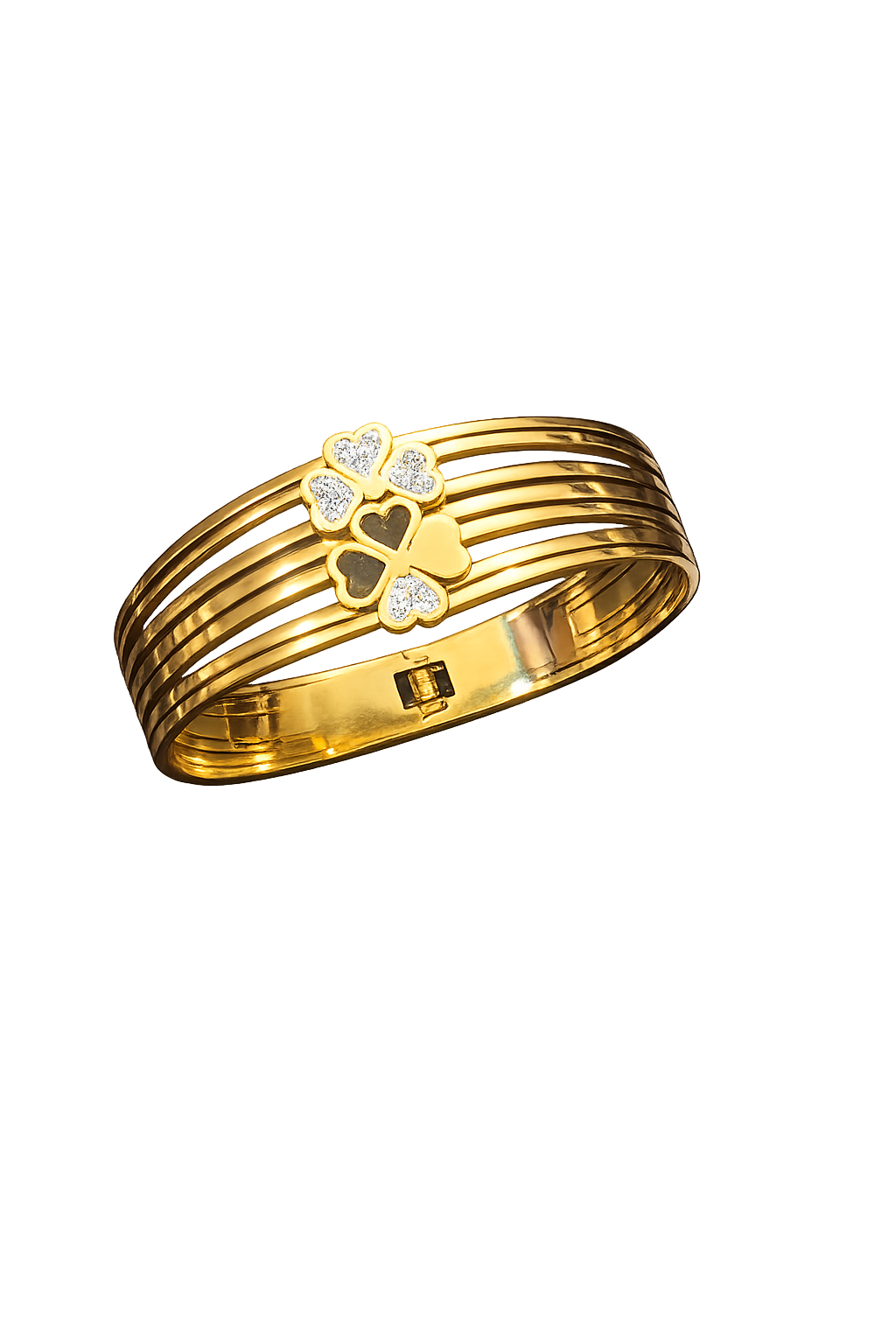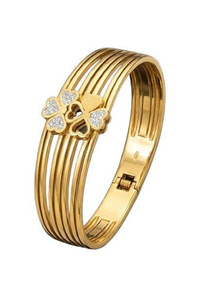 Celebrate charm and elegance with this golden bracelet, adorned with a delicate clover motif and subtle sparkling accents. A graceful statement piece for everyday luxury and festive shine.