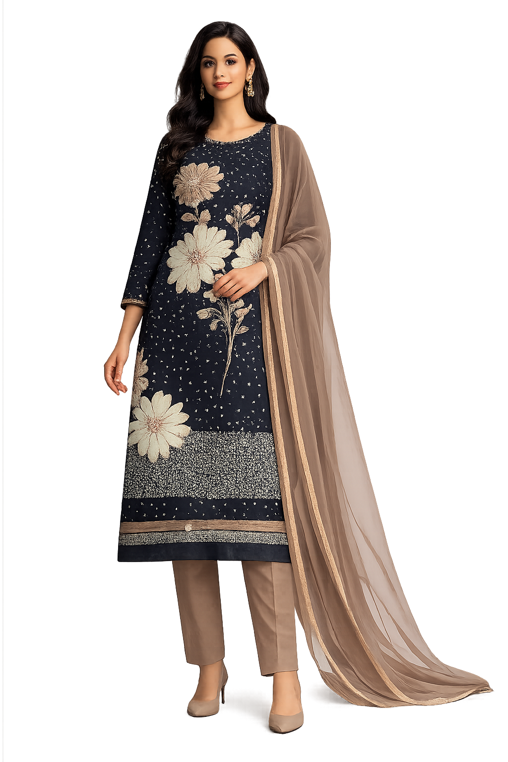 Refresh your ethnic wardrobe with this elegant unstitched suit set featuring a beautifully printed shirt enhanced with delicate ari work for a graceful, handcrafted touch. It comes with a plain 3-meter rayon bottom offering comfort and a flattering fall, paired with a 2.5-meter semi-pure dupatta that adds soft sophistication. Perfect for festive gatherings and stylish day wear.