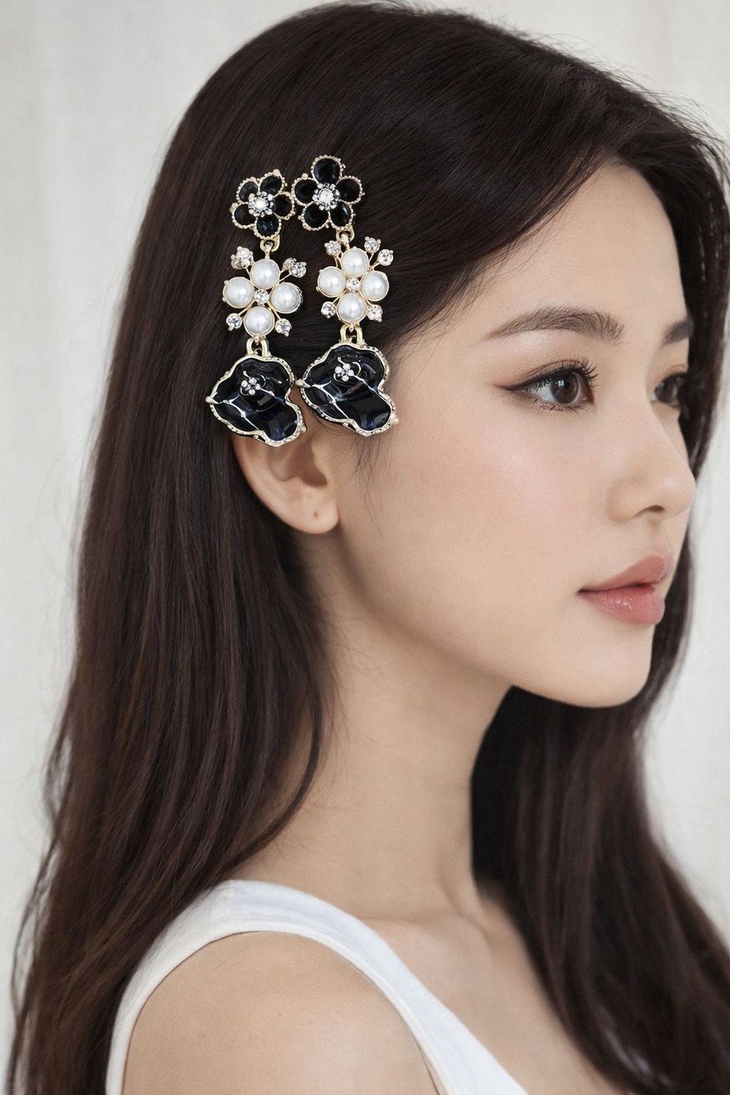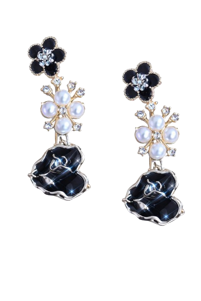 Elegant floral hair clips featuring glossy black petals, shimmering crystals, and delicate pearl accents. This charming pair adds a graceful sparkle and sophisticated touch to any hairstyle, perfect for both festive and everyday looks. ✨