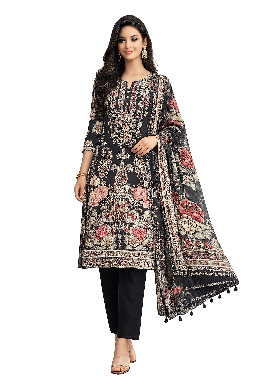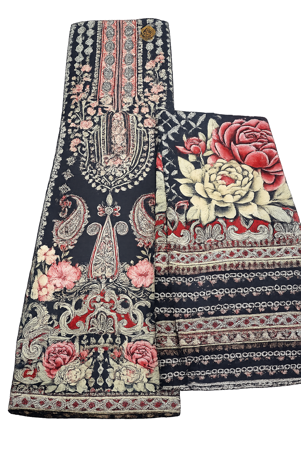 Refresh your wardrobe with this elegant printed cotton unstitched suit set, designed for effortless grace and comfort. The 2.5-meter shirt showcases intricate floral and ornamental prints, beautifully complemented by a 2.5-meter plain black bottom for a balanced look. Paired with a 2.5-meter printed dupatta, this ensemble is perfect for everyday charm or casual gatherings. Soft, breathable cotton ensures all-day ease with timeless style.