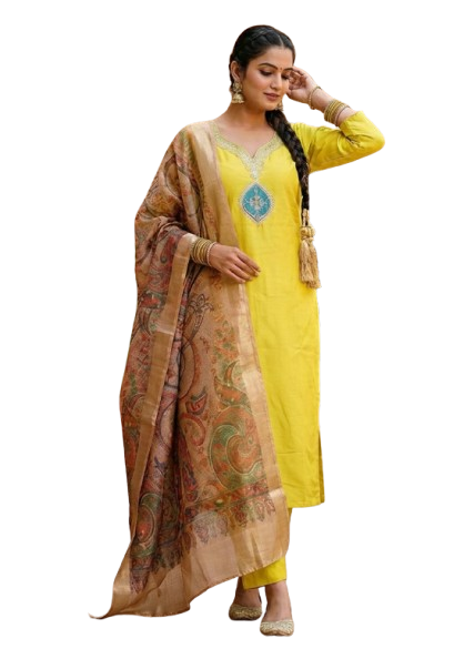 This eye-catching stitched kurti, pant & dupatta set in a refreshing neon tone features a 45-inch kurti beautifully enhanced with rich golden thread work and elegant patchwork embroidery on the neckline. Designed in a comfortable medium size, it is paired with a sleek plain pant, while the digitally printed dupatta adds a stylish contrast and graceful flow. Perfect for festive days, daytime functions, or vibrant casual outings.