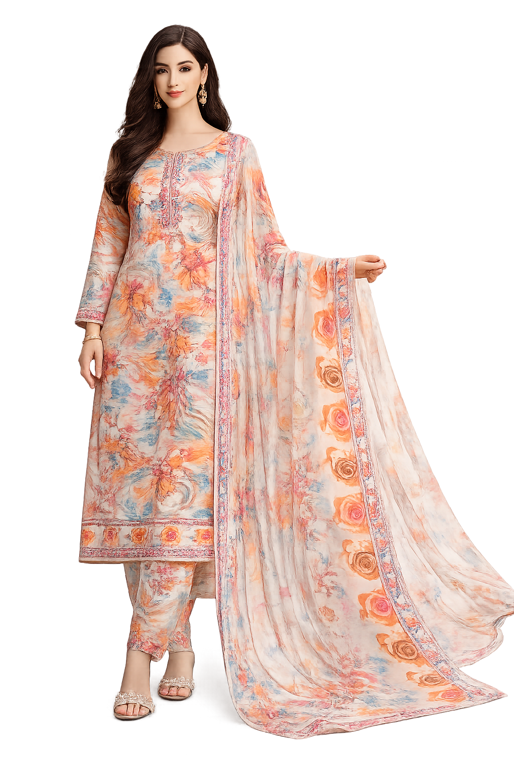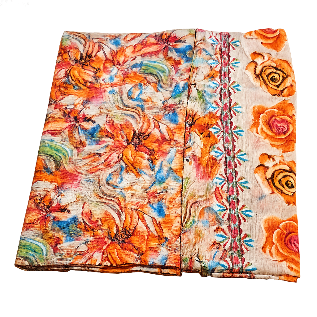 Elevate your ethnic style with this elegant 5-meter all-over printed unstitched suit featuring vibrant floral patterns and soft artistic shades. The beautifully coordinated printed dupatta adds grace and charm, making it perfect for casual gatherings and festive occasions. Crafted to offer both comfort and style, this suit allows you to tailor it to your perfect fit while showcasing a fresh, modern floral appeal.