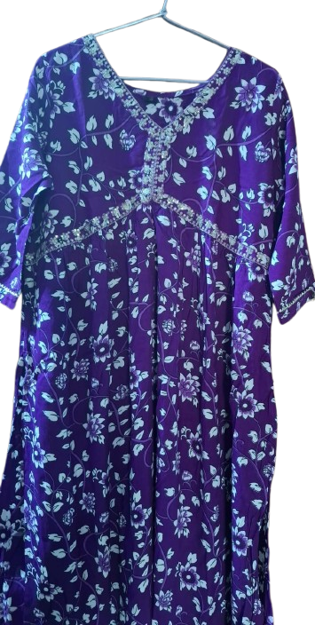 This elegant Stitched Nayra Cut Kurti in medium size features a flattering 45-inch length with graceful three-fourths sleeves. Adorned with a charming floral print and delicate lace detailing on the yoke, it offers a perfect blend of comfort and style.