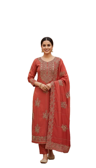 Elevate your festive look with this stunning rust color crepe silk 5-meter all-over unstitched suit. The shirt features heavy designer handwork embroidery, giving it a rich and luxurious appeal. Paired with a 2.5 meter chinon cutwork dupatta beautifully detailed with golden thread embroidery, it adds graceful charm. Completed with a plain bottom, this suit is perfect for weddings, parties, and special occasions.
