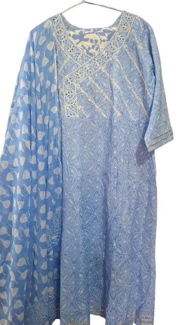 Step into effortless elegance with this beautiful sky-blue cotton A-line suit set. Featuring a delicately embroidered kurti with a flattering V-neck, paired with comfortable straight pants and a soft printed dupatta, this three-piece ensemble is perfect for daily wear, festive mornings, or casual gatherings. Lightweight, breathable, and graceful?comfort meets charm.